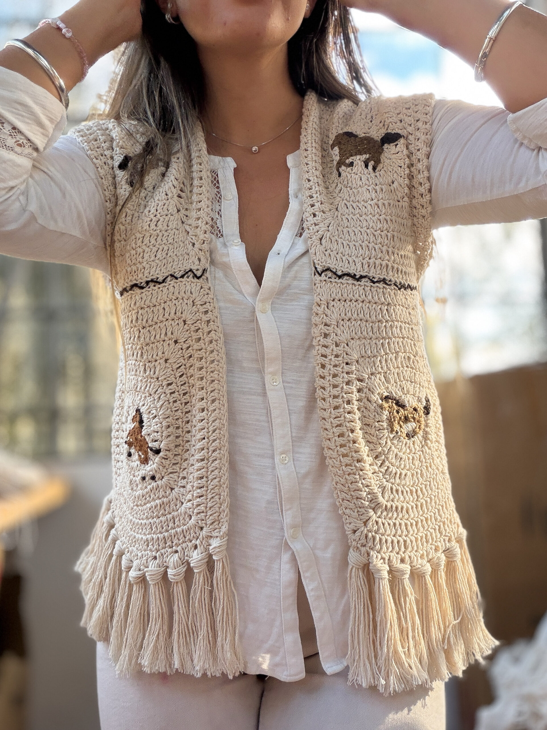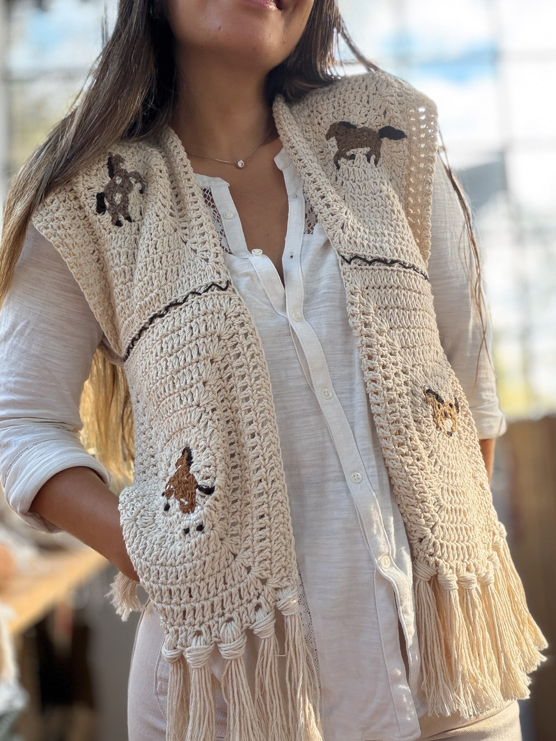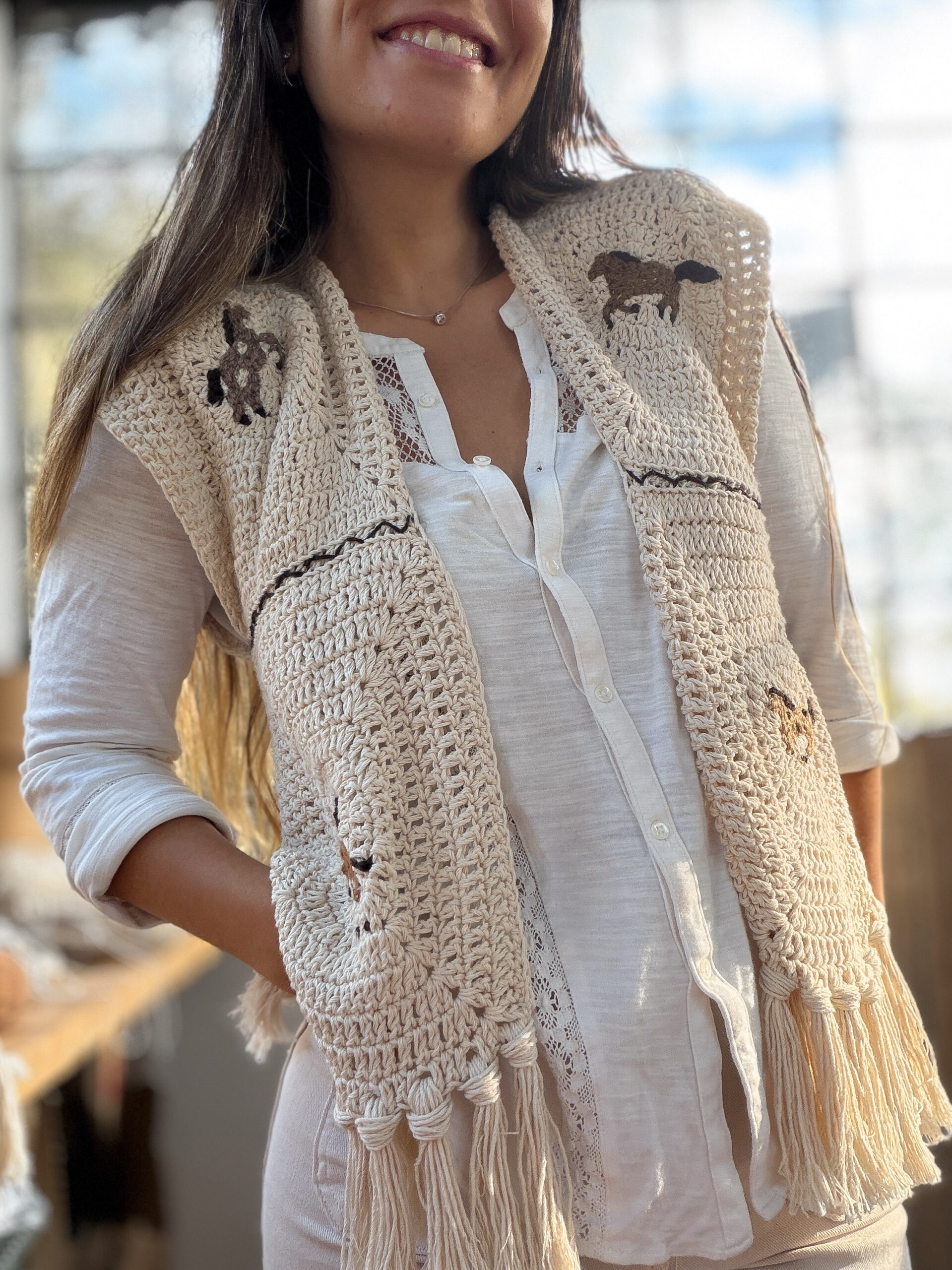 Está tejido a mano con técnica Crochet, con motivos de caballitos bordados ♥