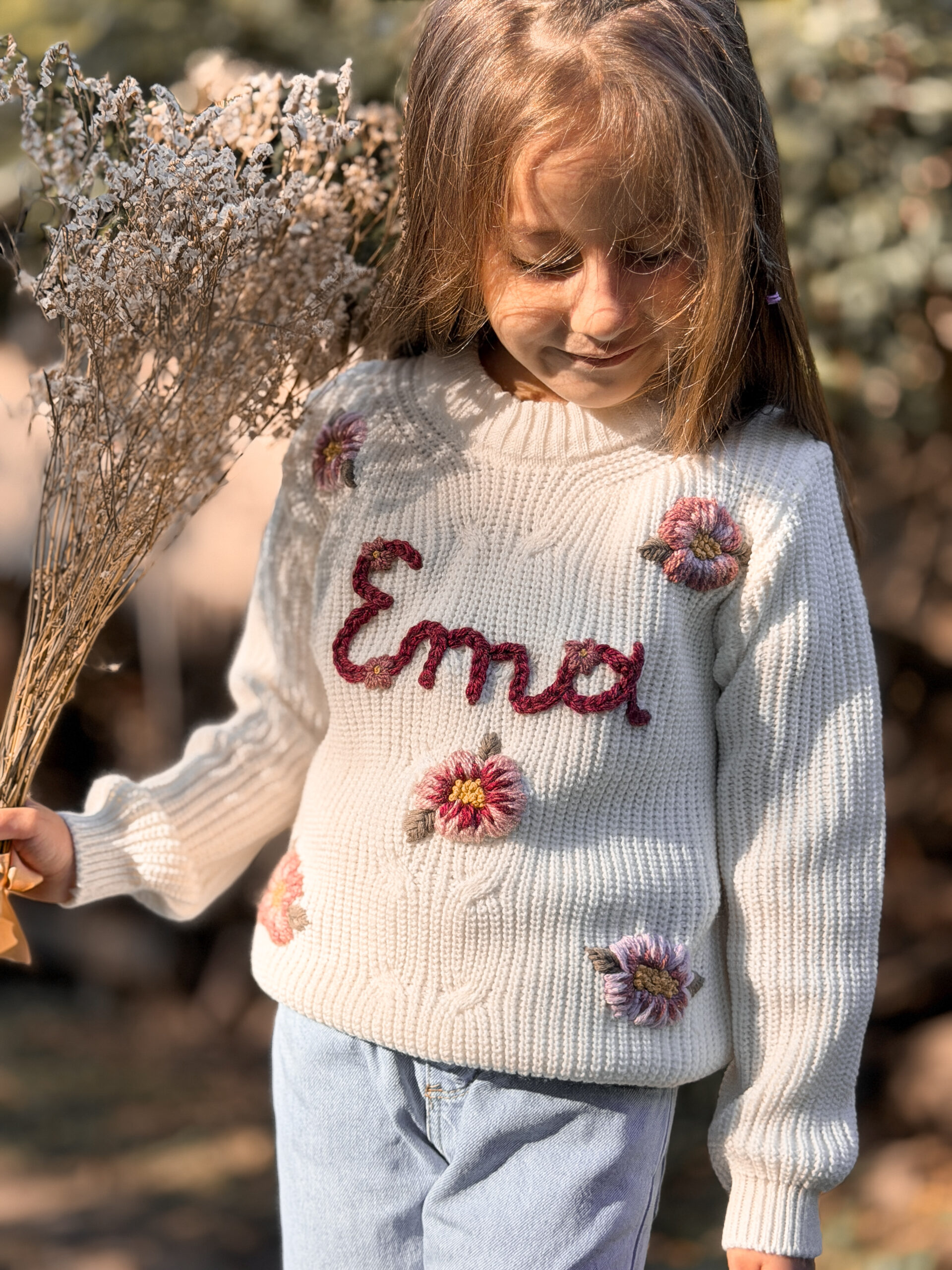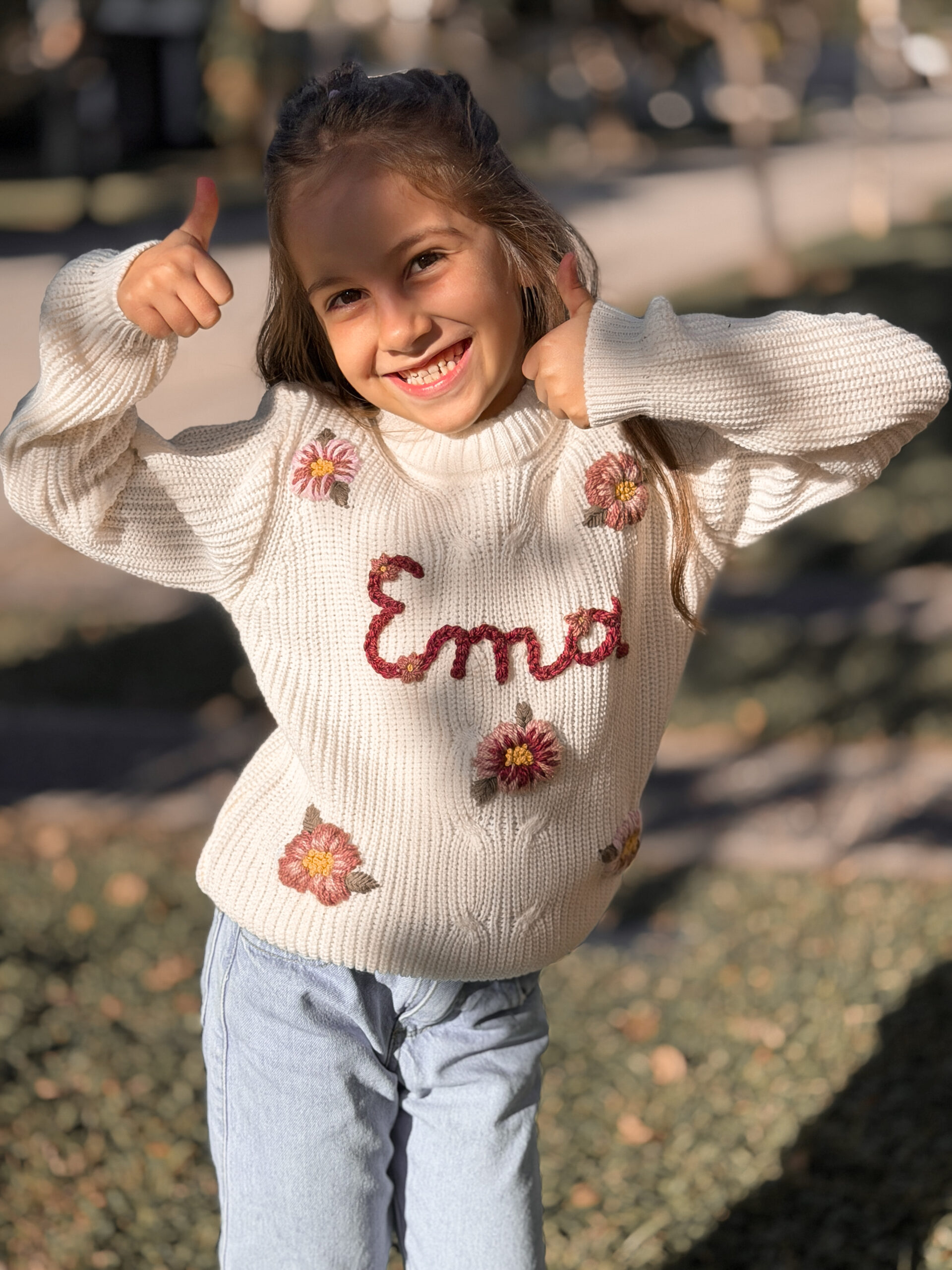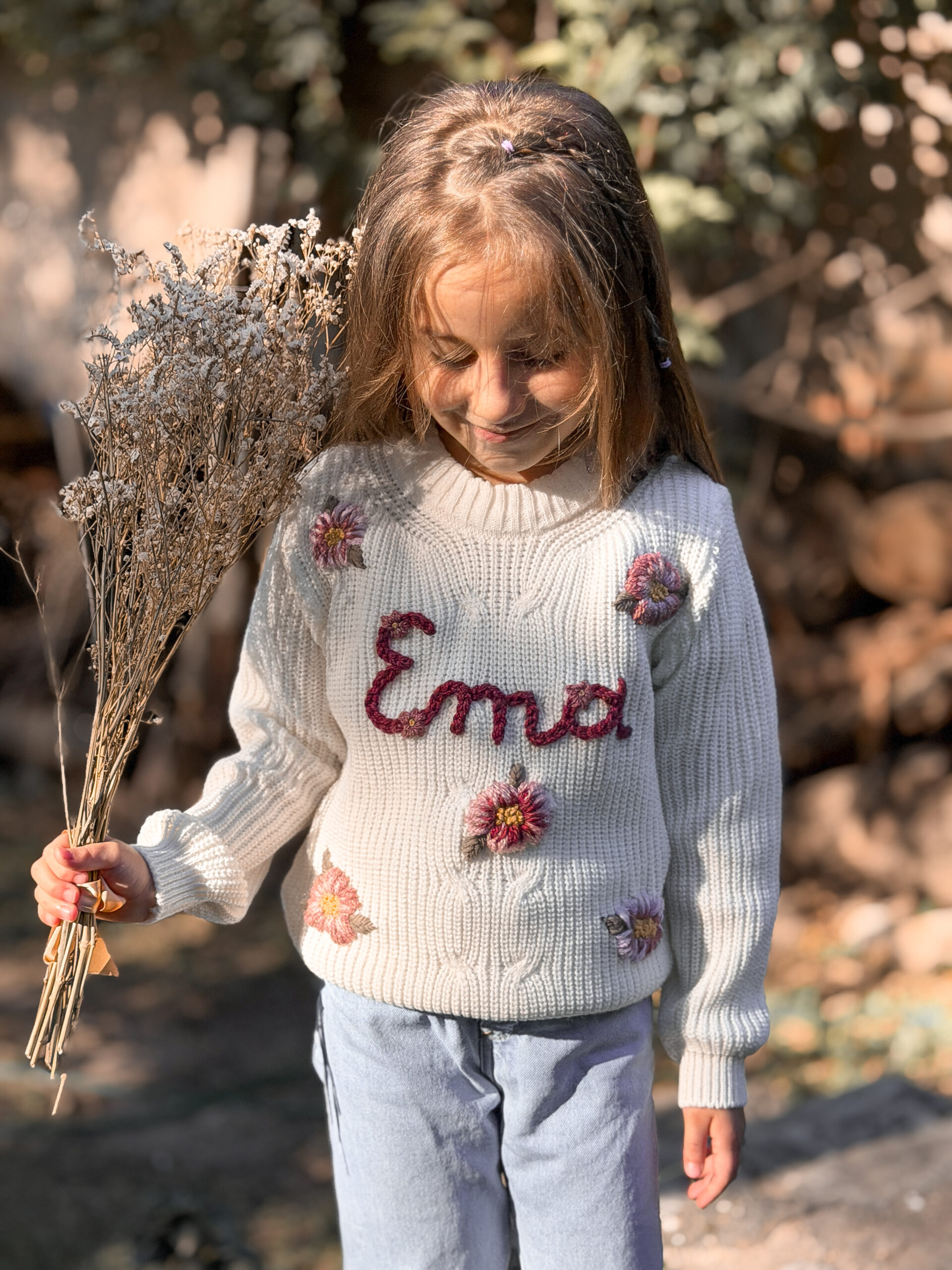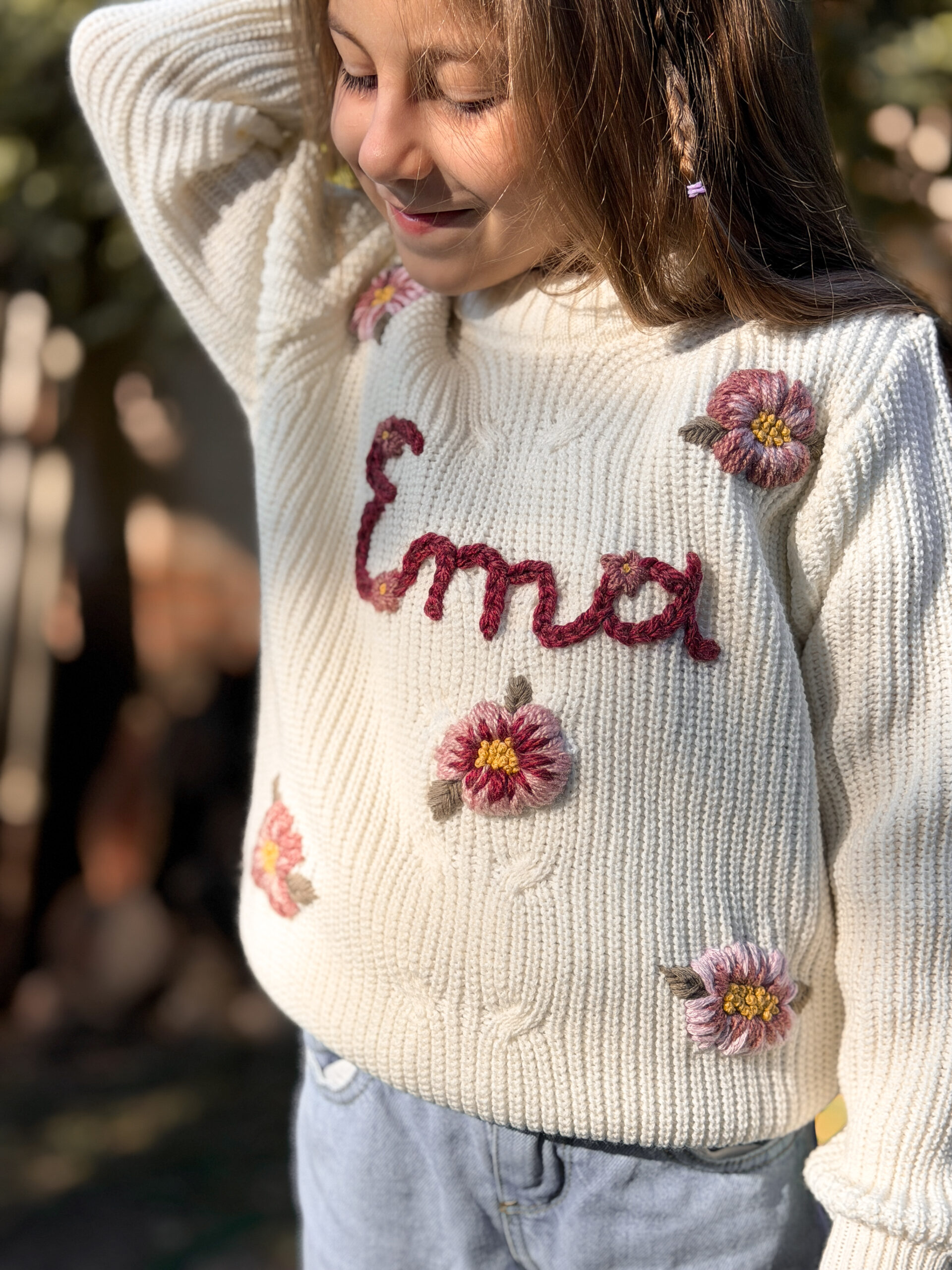 Este sweater es personalizado. Podes elegir el diseño que prefieras (flores, honguitos, duendes, animalitos, y un sinfín de etc!), y podes ponerle el nombre de tu niña, su inicial o lo que prefieras ♥