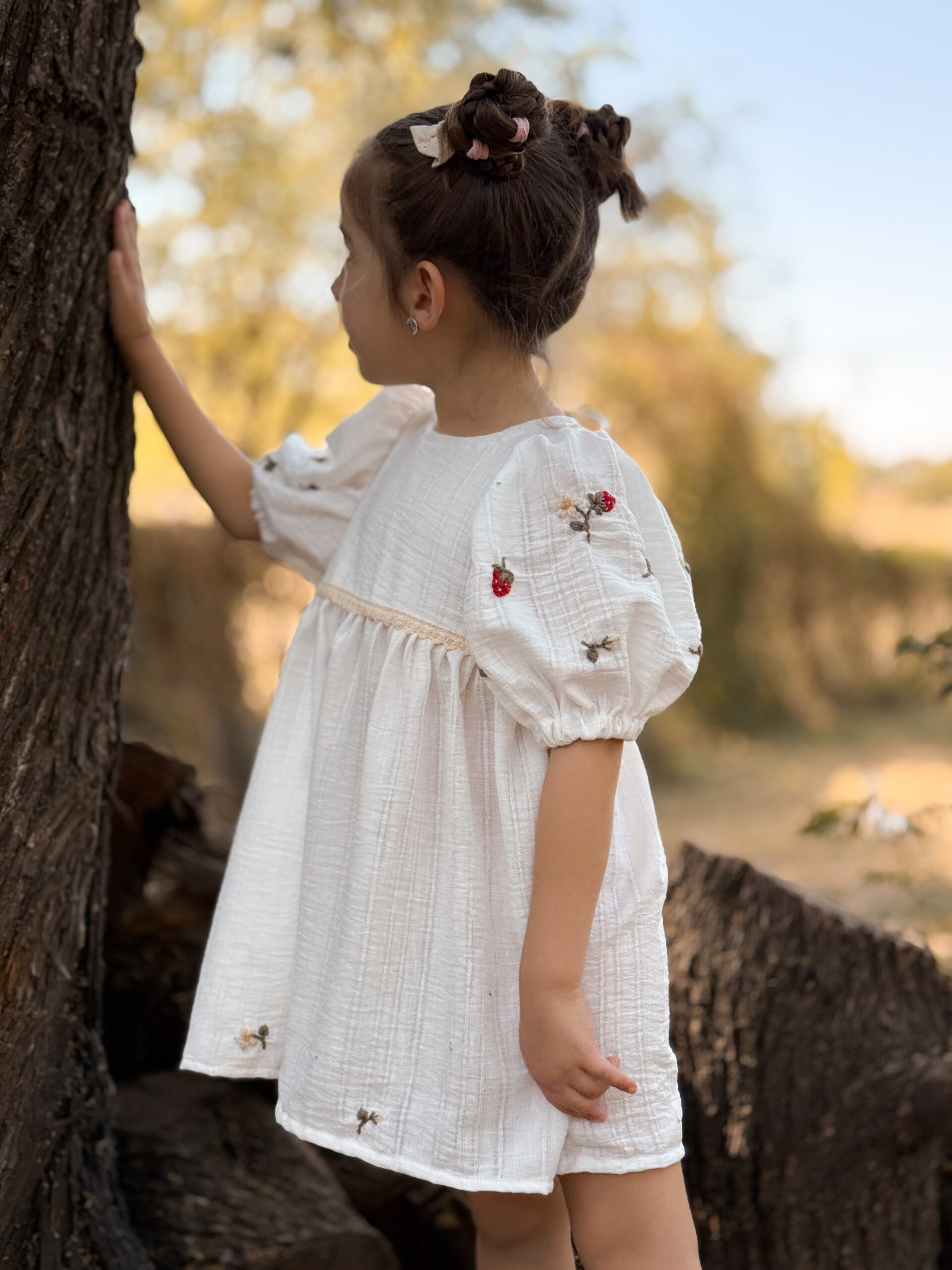 Vestido de Broderie color blanco, bordado a mano uno por uno, con motivos de flores, pimpollos y frutillas.