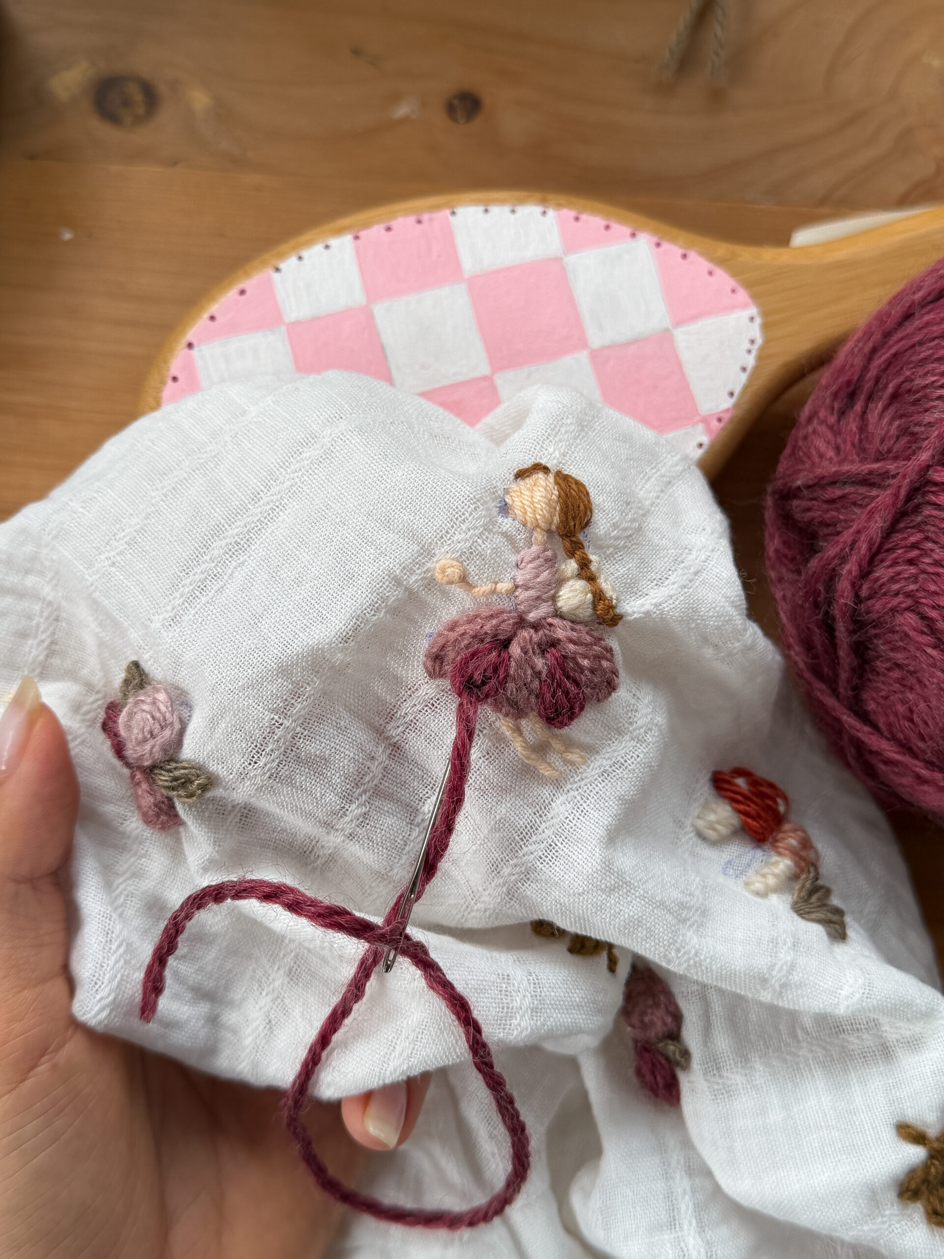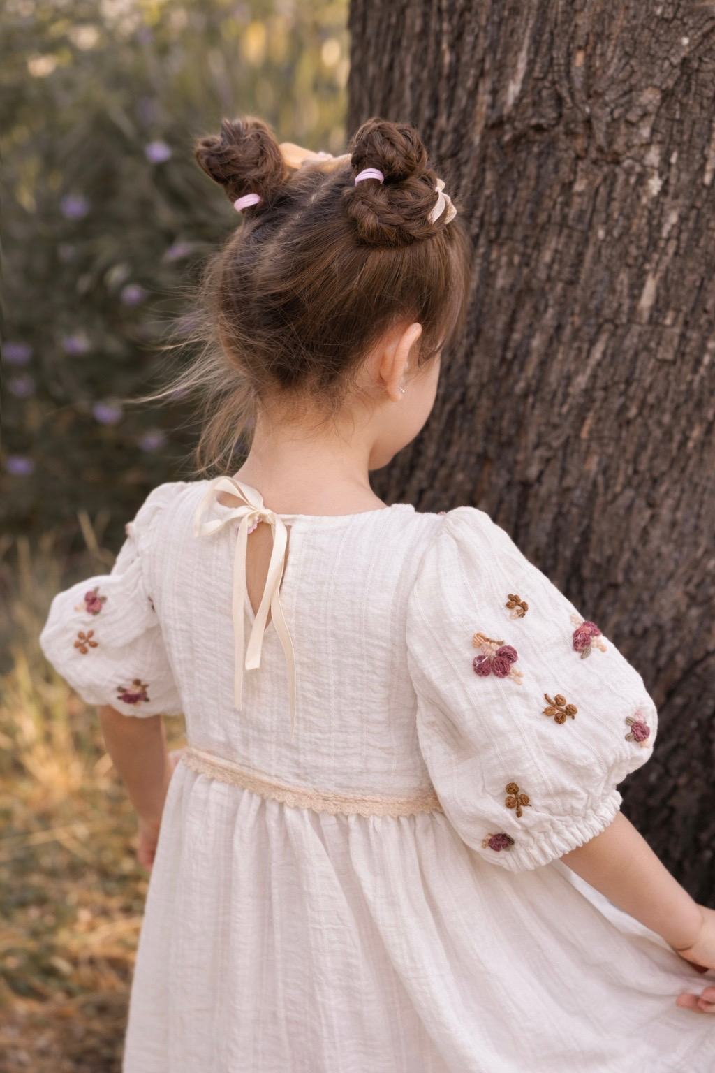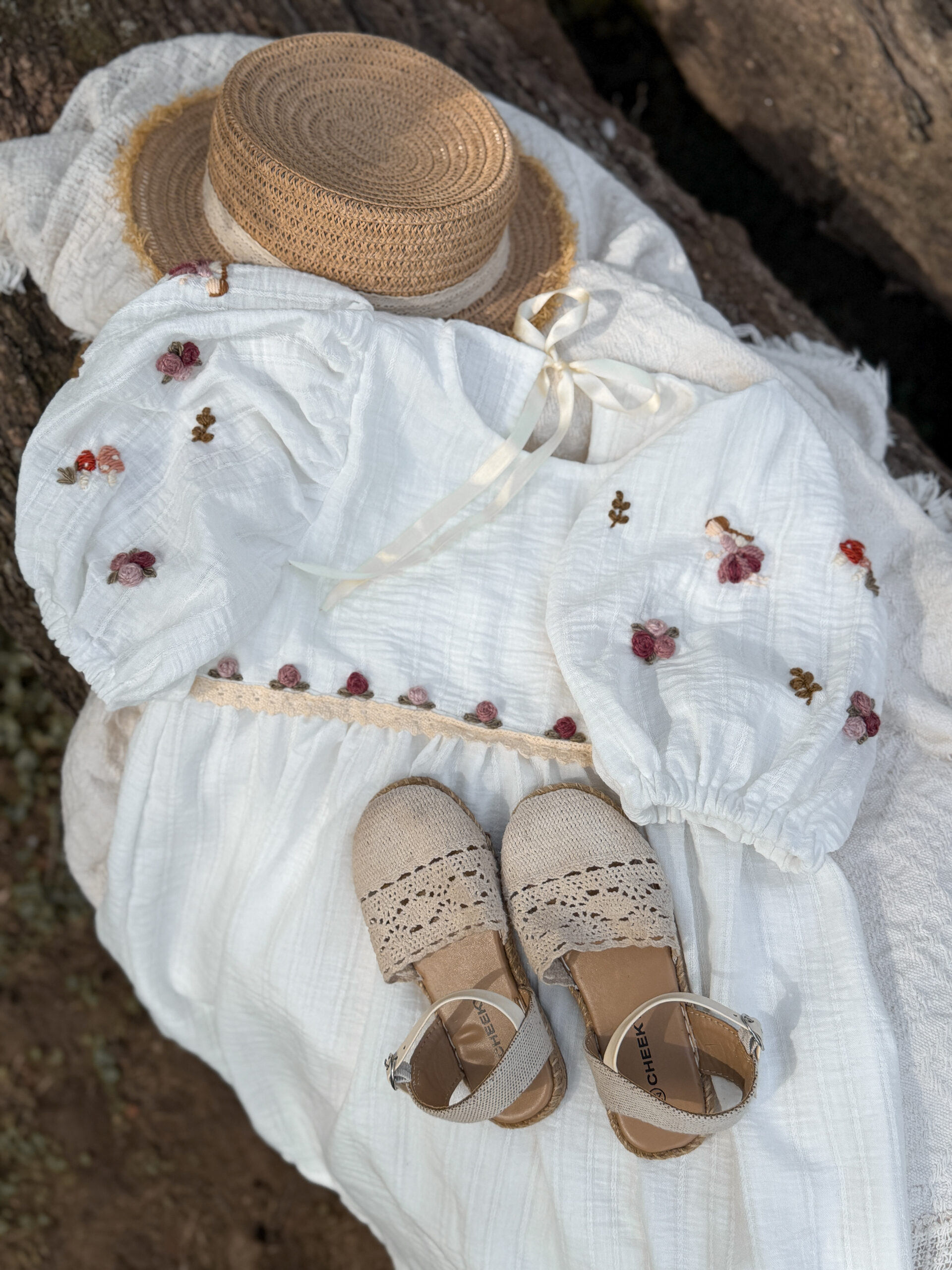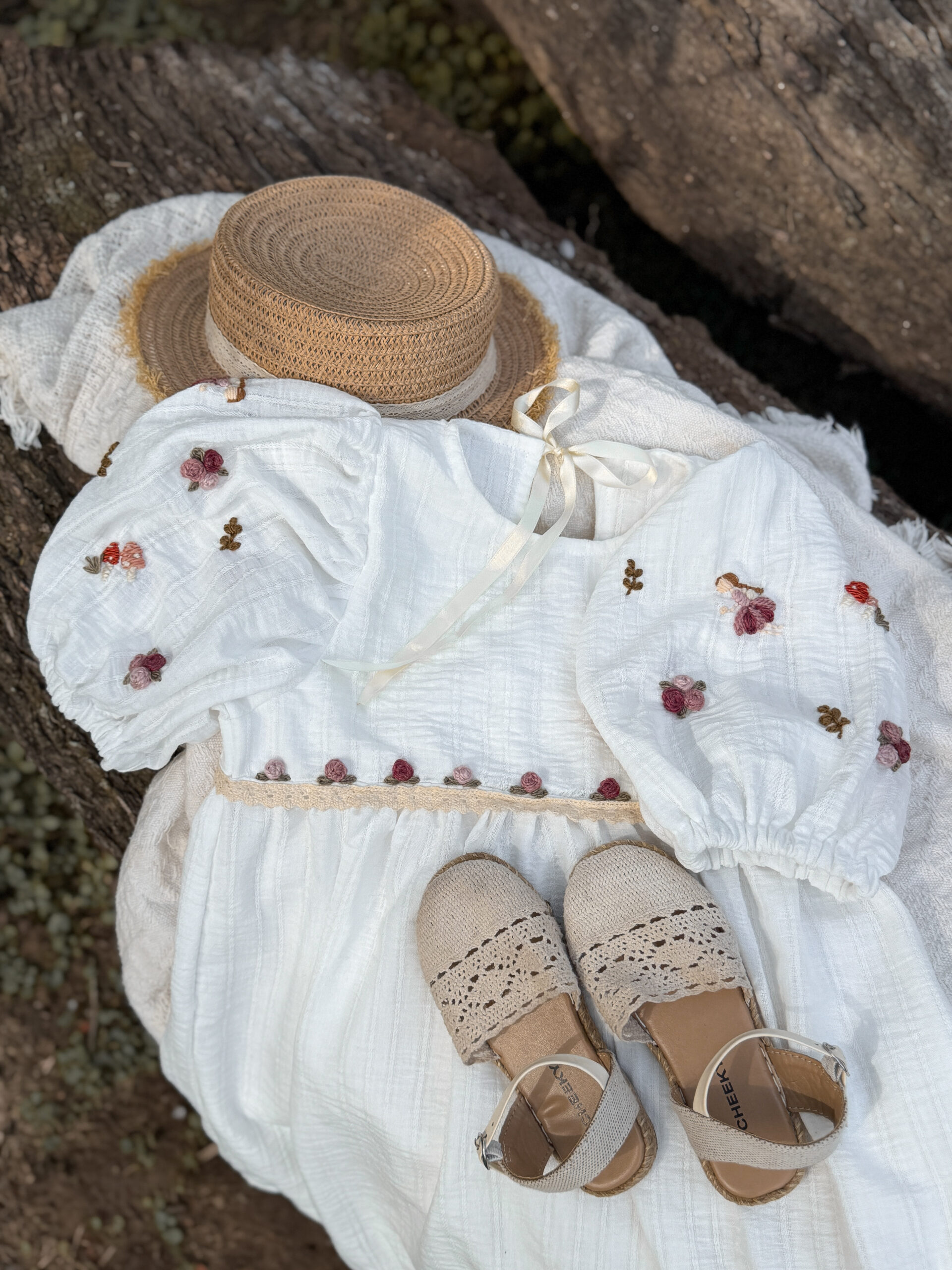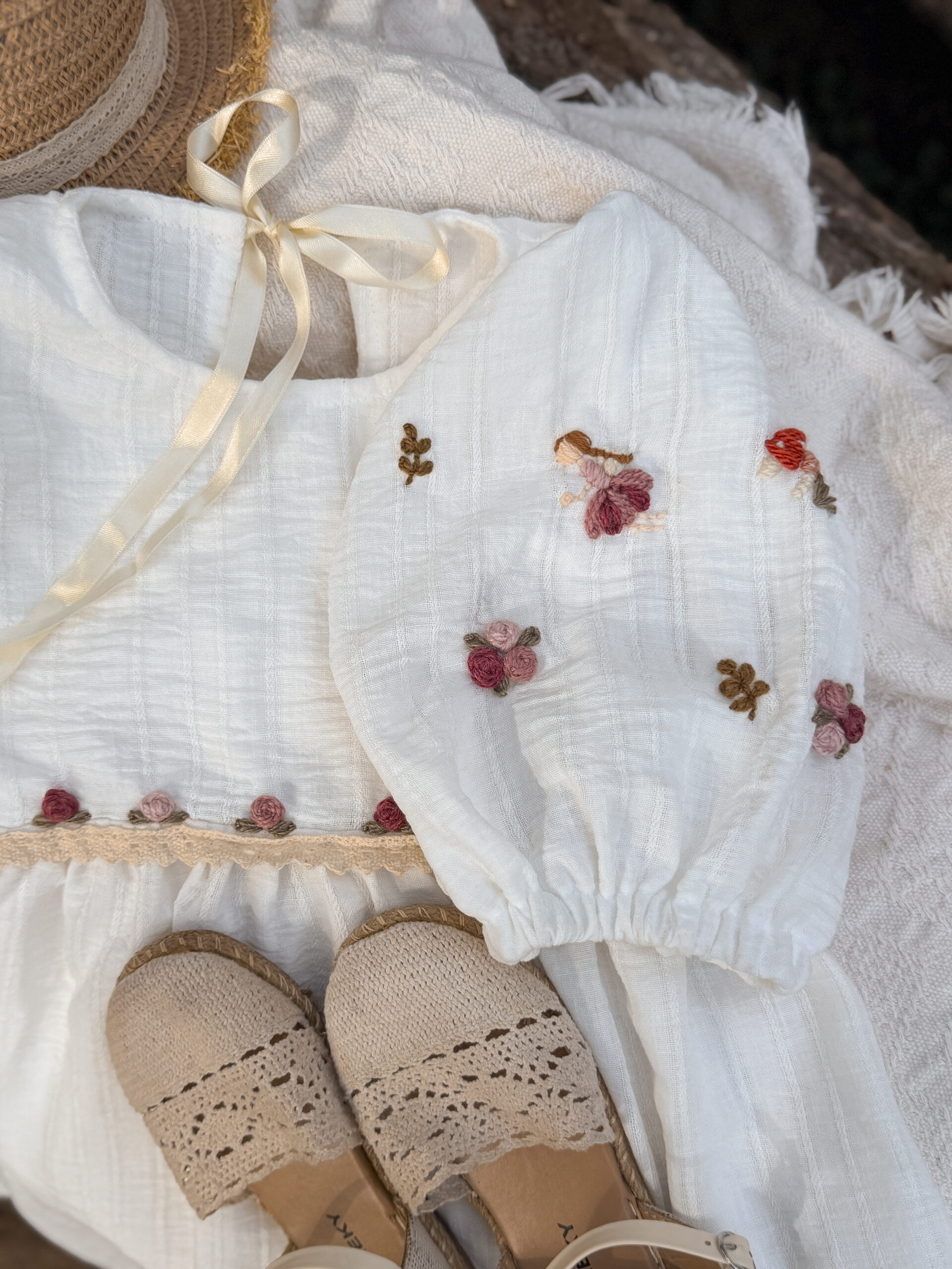 Vestido de Broderie color blanco, bordado a mano uno por uno, con motivos de flores, pimpollos y Haditas.